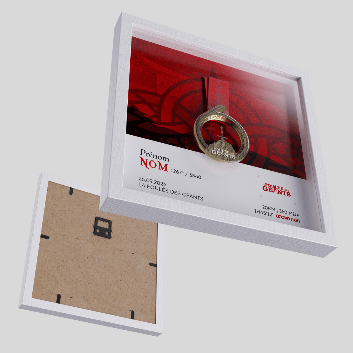 Précommandez le cadre Foulée des Géants, support de la médaille que vous gagnerez le jour de la course. Ce cadre sera personnalisé avec votre nom et prénom, votre classement, le temps et le nombre de kilomètres de votre course.